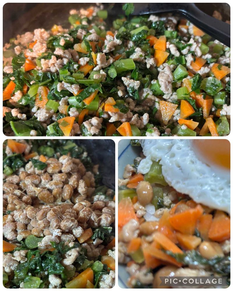 にんじんと炒めて、フライパンの半分を使って豚ひき肉をジュージュー🫚🔥 最後にカルシウム吸収量がアップする納豆を投入してさっと混ぜたら