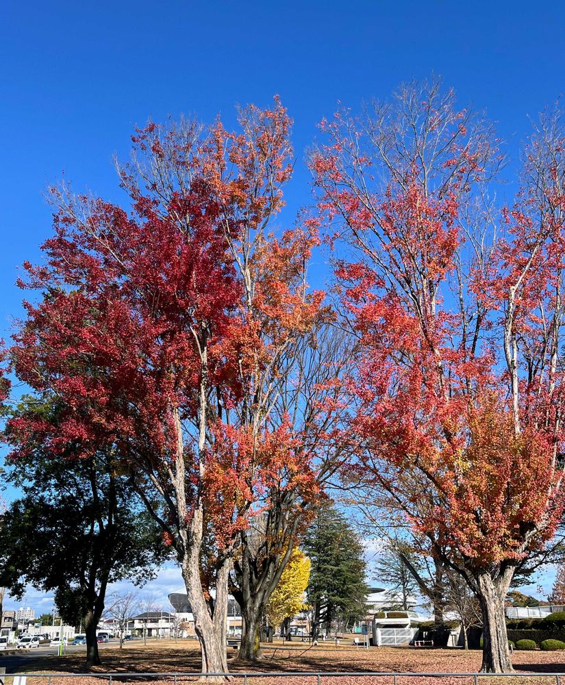 だいぶ葉が落ちちゃいましたけど、総合運動公園内に有る🍁カエデ🍁の紅葉が青空に映えて、綺麗です😆👍🍁🍁🍁🍁🍁