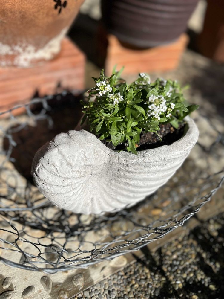 ナンキュララス小春日和と新しいオオムガイの鉢にアリッサムを植えました。
