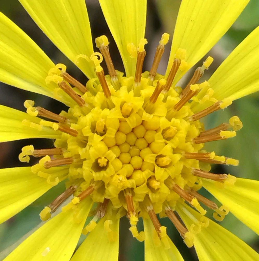 舌状花(雌花)の先がクルンクルンとなった雌しべと 筒状花(両性花)の突き出た柱頭を撮ってみました😄