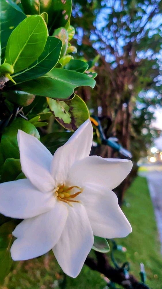 散歩道に咲くガーデニア。いい匂いがします。大音量のクリスマスソングの中、夕方のウォーキングです。