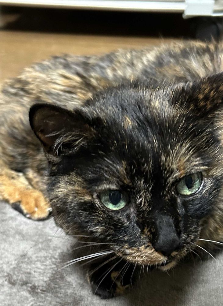 くーちゃん🐱がぬくぬくしてるところを撮ろうとしたら、ムクっと顔をあげて😅