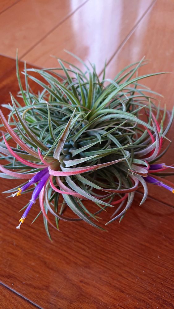 チランジアのお花、2つも咲いてる!!😳 ̖́-︎結構大きいチランジアかな?水やりは霧吹きシュッシュしているの?