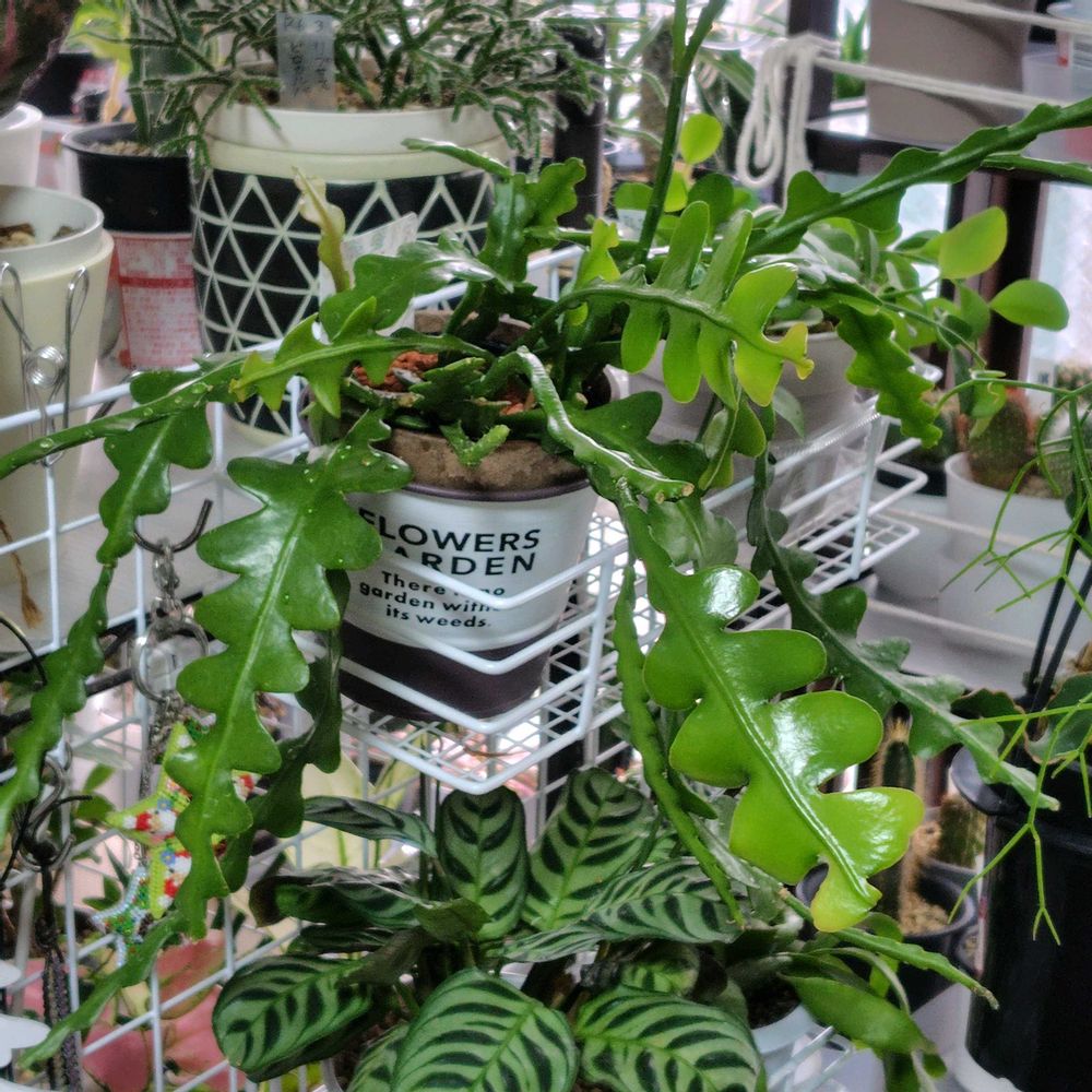 魚の骨の様な姿をしているエピフィルム属のサボテンで,正式名称を"クリプトセレウス・アントニヤヌス"といい,市場では,"フィッシュボーンカクタス","ジグザグカクタス","クジャクサボテン","ムカデサボテン","エピフィルムアングリガー"の名で出回っている,高い所に置いたり,吊るして楽しむ事が出来る事もあり,インテリアグリーンとしても人気のある植物です。"月下美人"に似ていて,4月〜6月の初夏の夜に,香りの良い白やピンクの美しい花を,咲かせます。