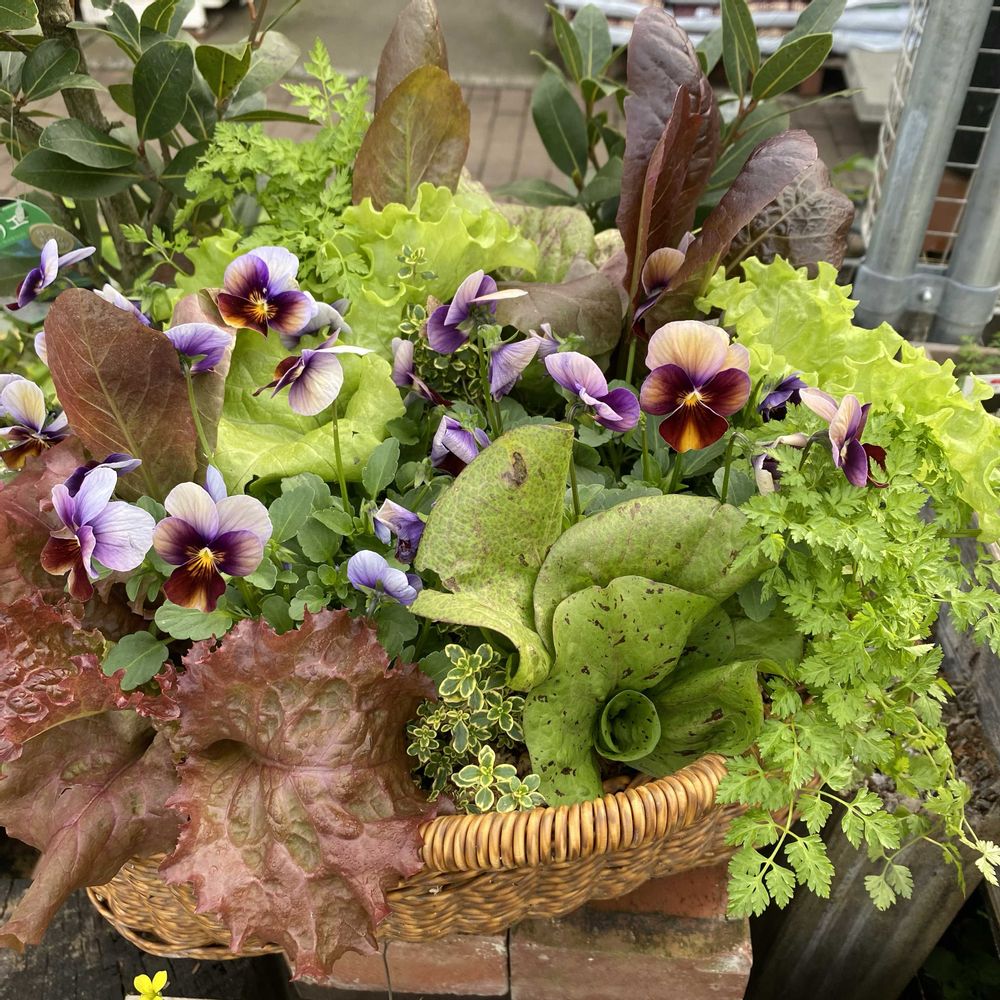 サラダ菜とビオラの寄せ植え 素敵な発想てすね♡