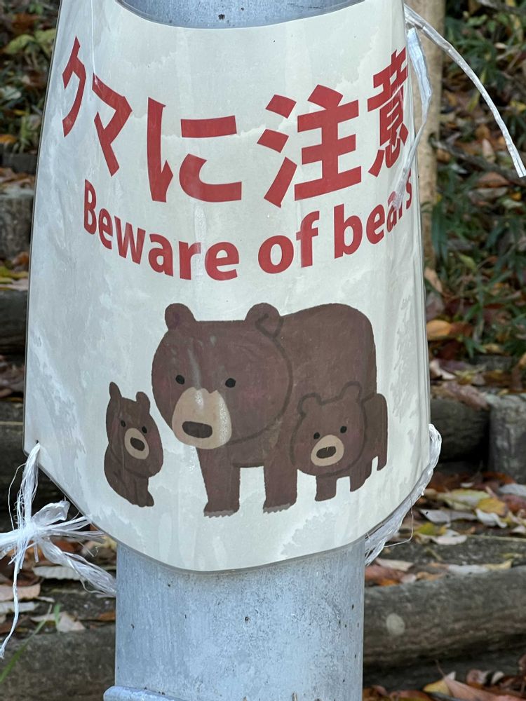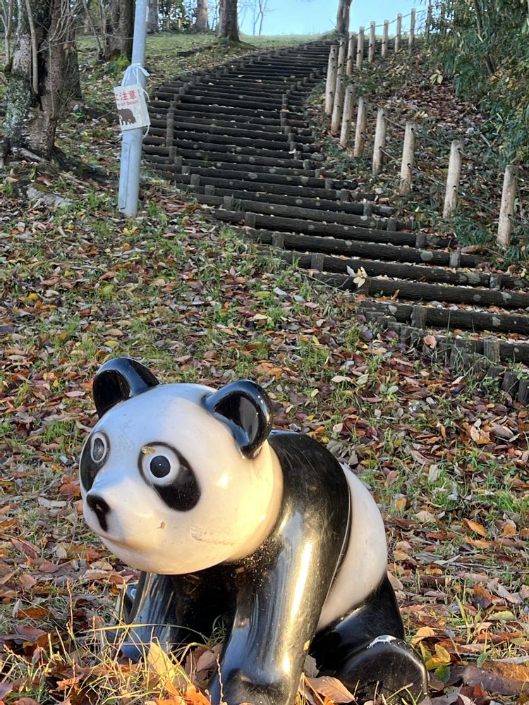公園のパンダも落ち葉に埋もれてましたが、丘への階段の途中には🐻⚠️の注意書き🗒️