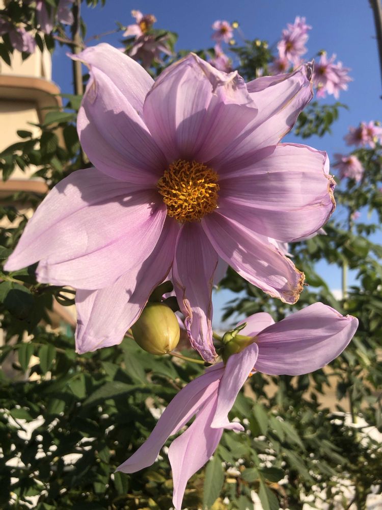 晴天の下、薄ピンク色の「一重咲き皇帝ダリア」をパチリ!📸🌸🌿😄🤗🌞👌