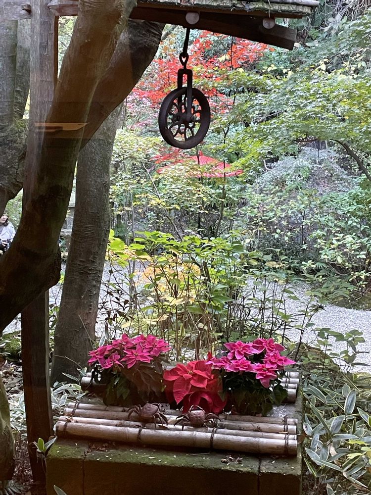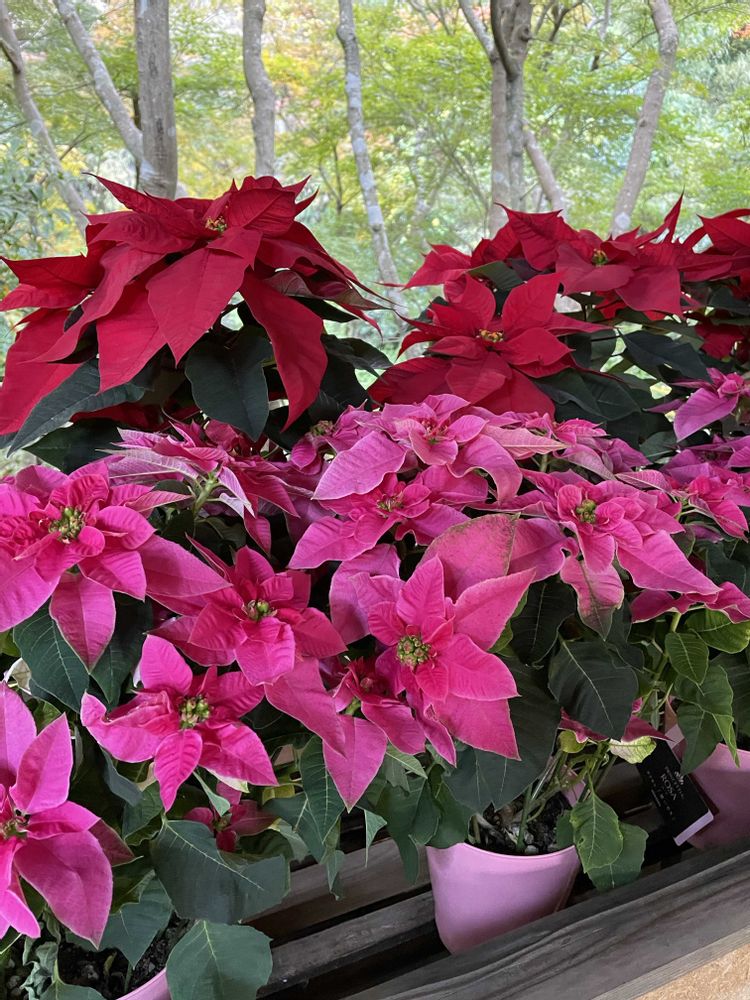 クリスマスカラーのポインセチアの赤い苞と緑の葉、鮮やかなピンクの苞が見事に和の庭園に調和していました*・゜゚・*:.。..。.:*・'(*゚▽゚*)'・*:.。. .。.:*・゜゚・*