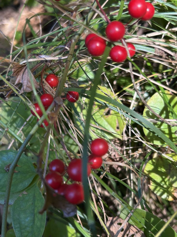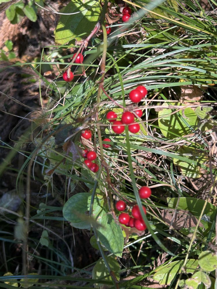 今迄こんなに沢山赤い実の付いたサルトリイバラ見たことなかったから、なんだ?なんだ?で、枯れ枝や枯れ草など掻き分けて入り、やっとサルトリイバラらしい葉っぱを見つけました。それでももっと草などを外して見たいのに、手を薮に突っ込むのが気持ち悪くて、こんな撮影で終わりました💦やはりこの数珍しいですよね〜🤔
