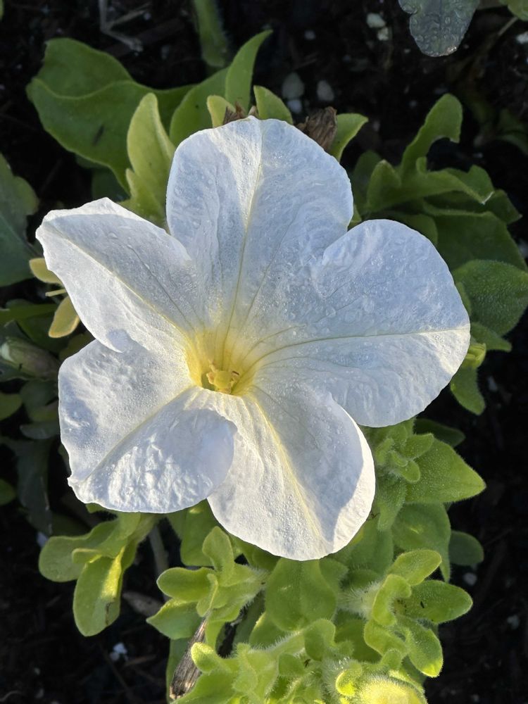 Petunia atkinsiana/Petunia. Solanaceae. Solanales. Magnoliopshida. Tracheophyta. Commonly called/Garden Petunia Dream White Petunia Native to/South America Symbolism/(white flower) Existence *Genus of about 40 species. *The flowers, 1 1/4-5in(3-13cm) *Petunia was born in England(1834). *In England this flower shows “Silence”. *Petunia x atkinsiana was discovered on February 17, 2020. Photographed 12/2 8:47am 2024 Posted 12/2(Monday) 12:08pm 2024