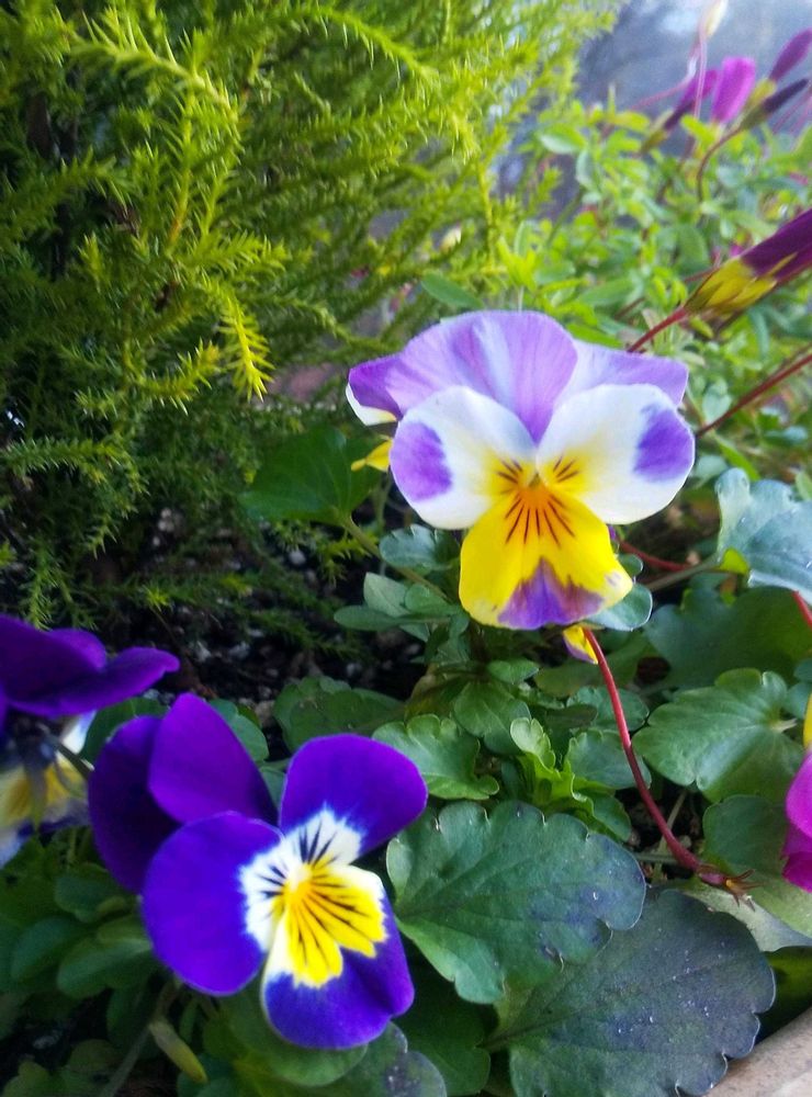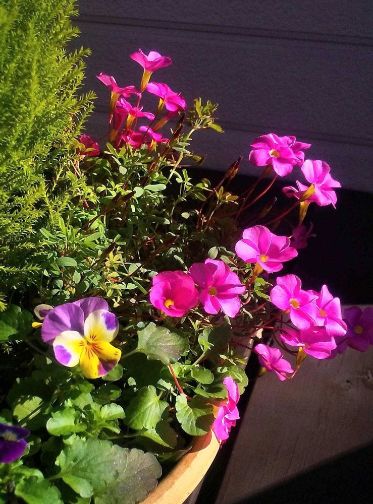 何年か前に寄せ植えしたコニファーの鉢に、こぼれ種からビオラさんが咲いてきました❀ 今年はオキザリスをプラスして✨🌿💕