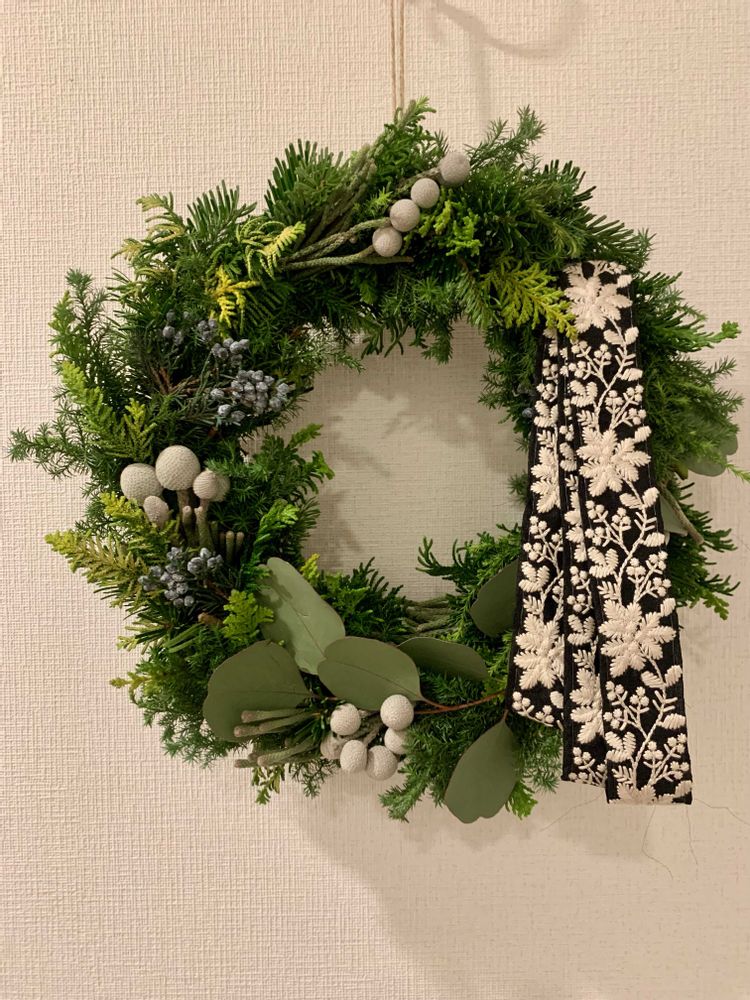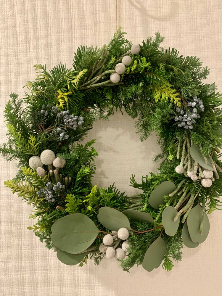 友人が用意してくれたシルバーブルニアが素敵だったので、今年は色合いがシンプルなリースにしてみました🌿