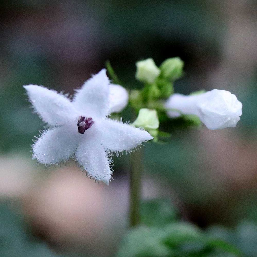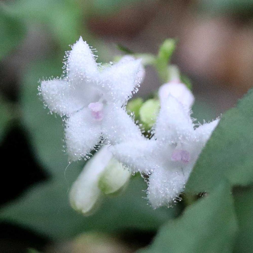 花は茎頂に巻散状の集散花序をつくり、白色で、長さ1.5㎝ほどの漏斗状。先が5裂する。花びらに細かい毛が密生している。