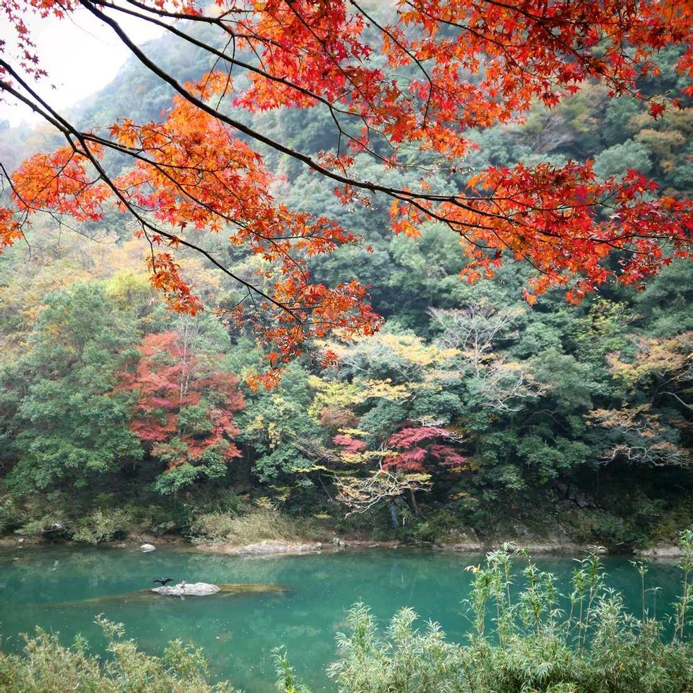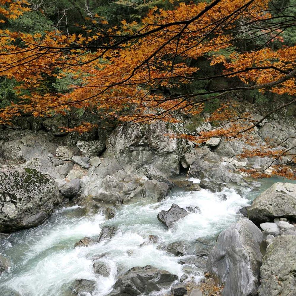 山口県では紅葉の名所の渓谷なんですが、行ったときは少し早めだったんで、なるべく紅葉の木を選んで撮りました 🍁