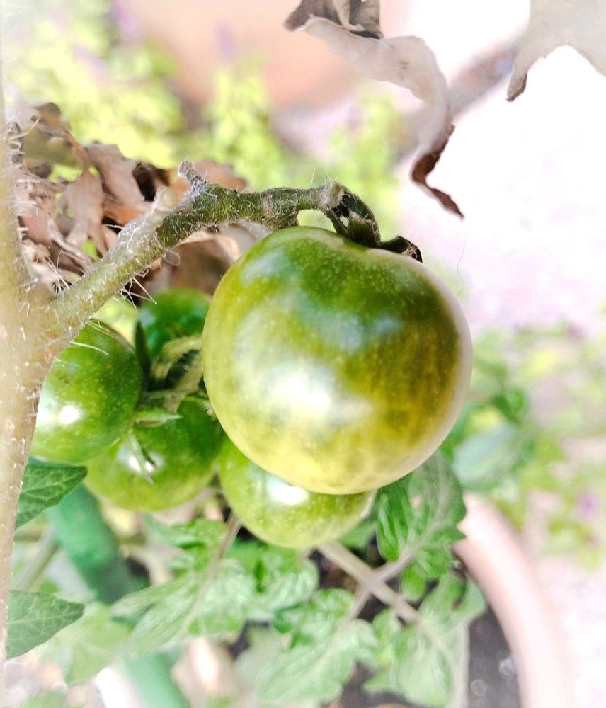 ミニトマト……緑の実……赤くなるかな〜?ちょっと色づきかけてる?