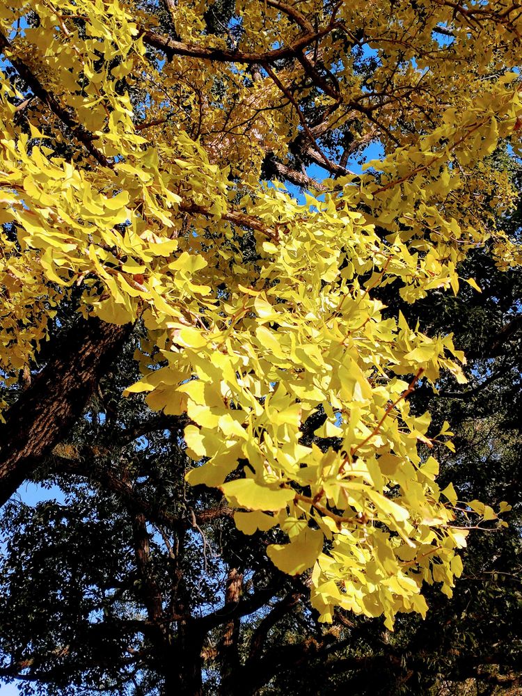 晴れの日が続いて暖かいです✨植付けたばかりのビオラの花と毎朝にらめっこ☺️💕2pic目は公園のイチョウ🌳やっとここまで色付いた〜🙌昨年より1ヶ月ほどの遅れだそうです💦