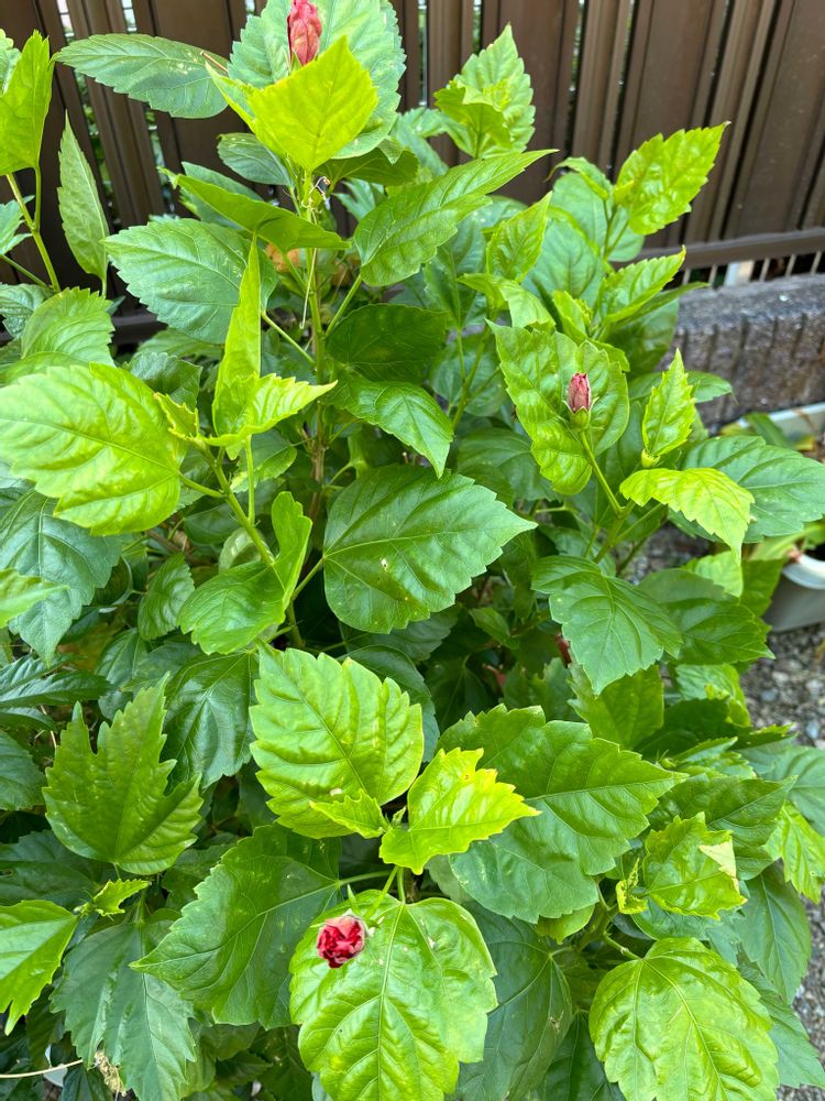 ずっと咲いてなかったけど、赤いハイビスカスにみっつ蕾が付いてます
