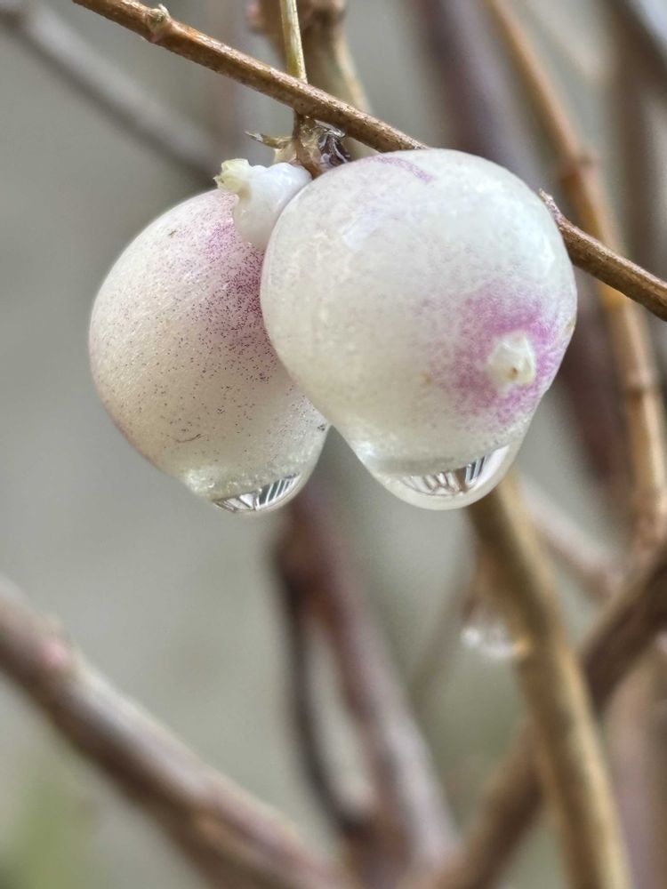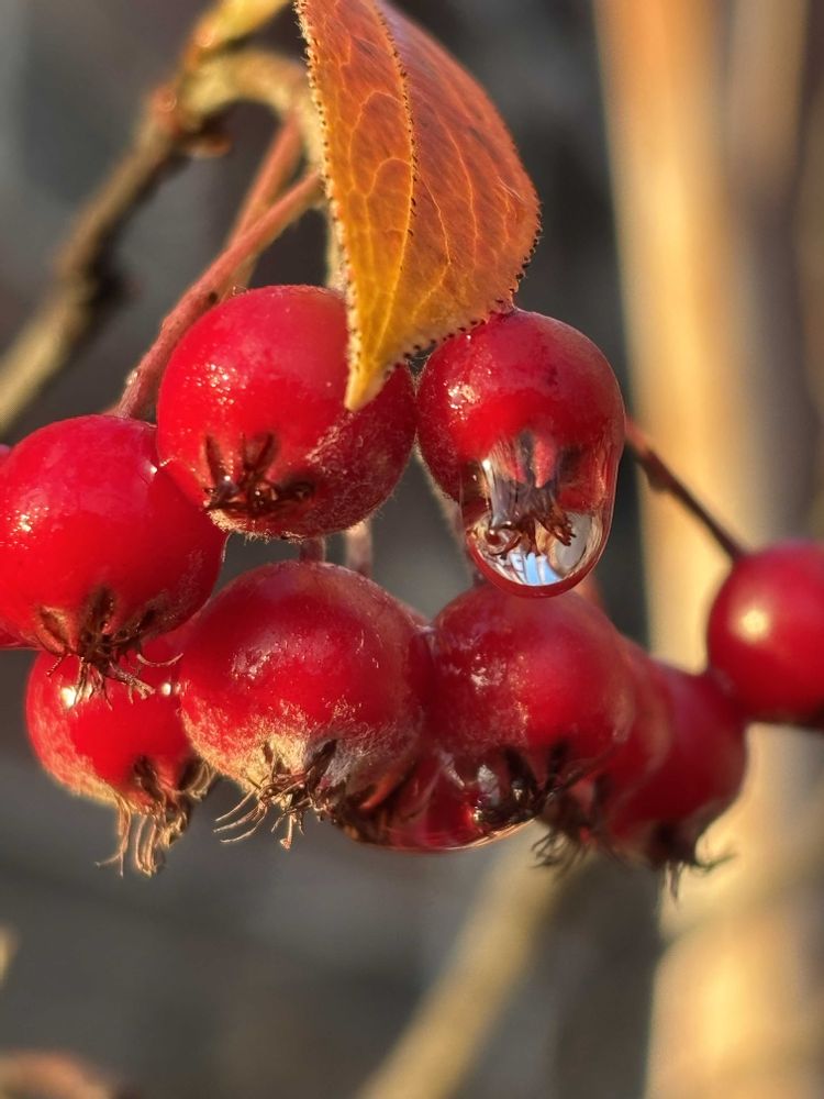 アロニアに雫を見つけて、他にもないかと探したら、寒さの中でわずかに残った実や葉に滴がついていました。落ちないうちにと焦って撮りました💧😅