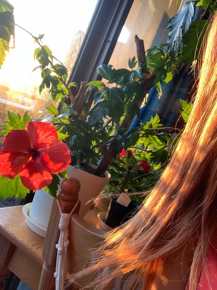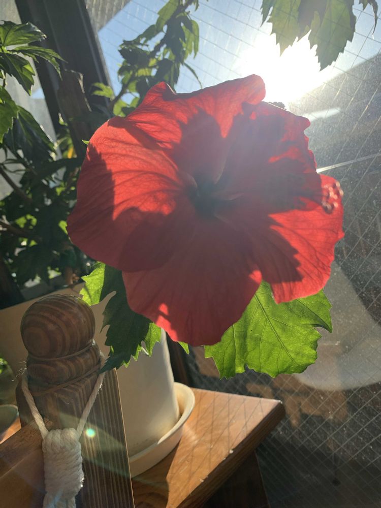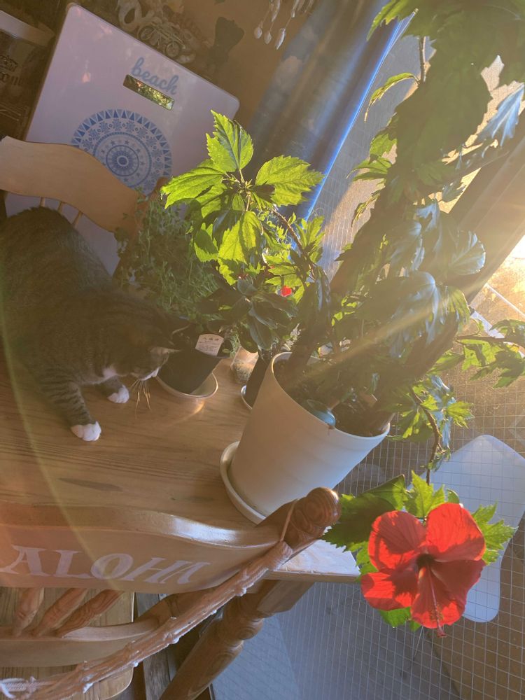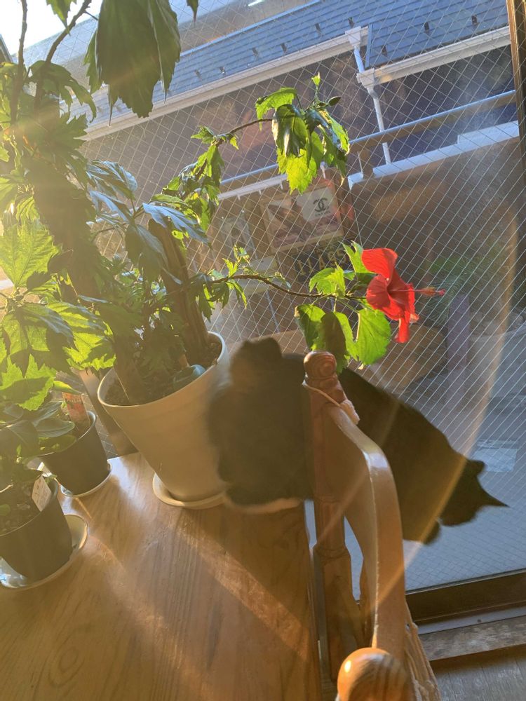 朝仕事に行く前に投稿したのでみんなの所にもまだ行けてないけどこれは仕事に行く前に太陽の日差しを浴びてる姿の我が家のハイビスカス🌺とゆうちゃんとプア🐱を撮りました😊