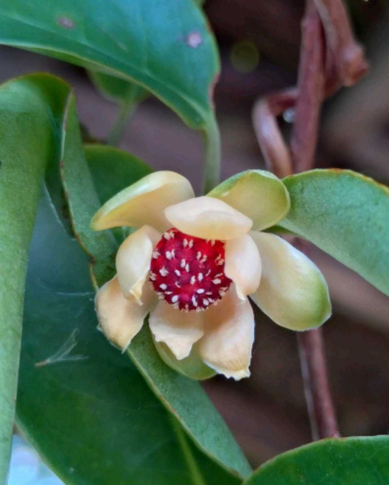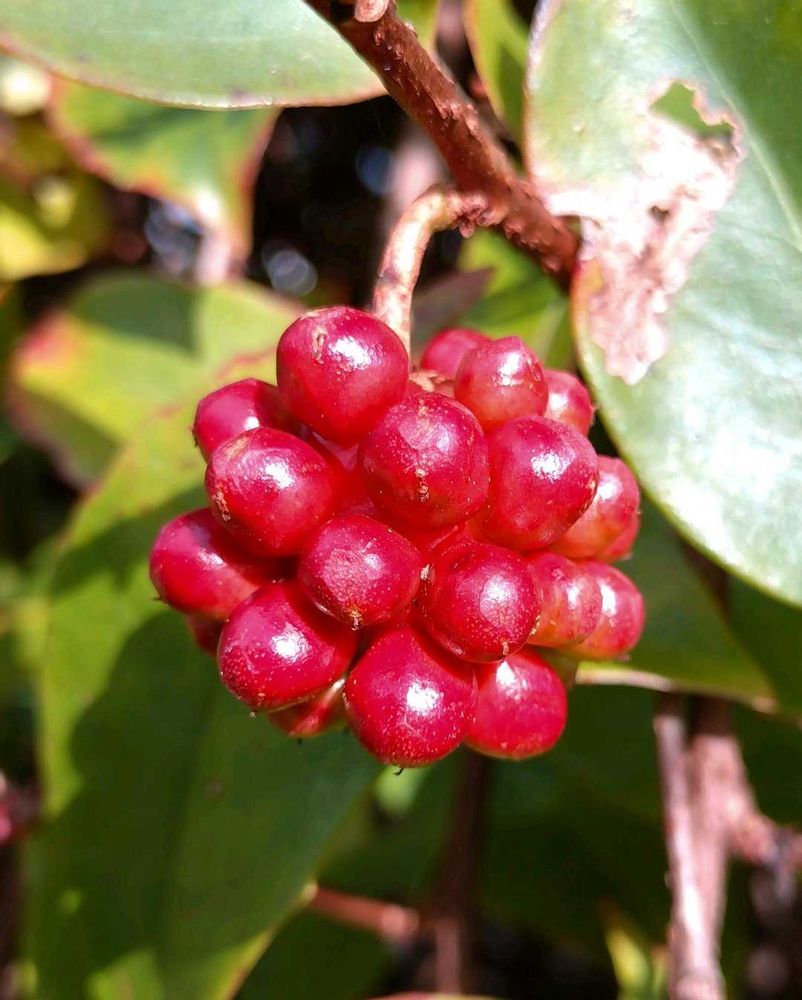 マツブサ科サネカズラ属の常緑つる性木本。山野に自生し、庭木や生け垣にも使われる。全縁に見える卵形の葉には通常まばらに鋸歯があるが、全縁の葉もあって混在する。常緑性だが、葉は寒さで紅葉する。花期は8月。淡黄色の小さな花が垂れ下がって咲く。雌雄異株だが両性株もある。雌花は雄花より小さい。雄花は赤球の雄しべが目立ち、雌花は緑白球の雌しべが目立つ。果実は丸い液果が20~30個集まって3㎝ほどの集合果となり秋に赤く熟す。1個の実の中に2~5個の種子が入る。白い実のシロミサネカズラもある。古いつるは丈夫で柔らかいので籠材や縄の代用として使われる。