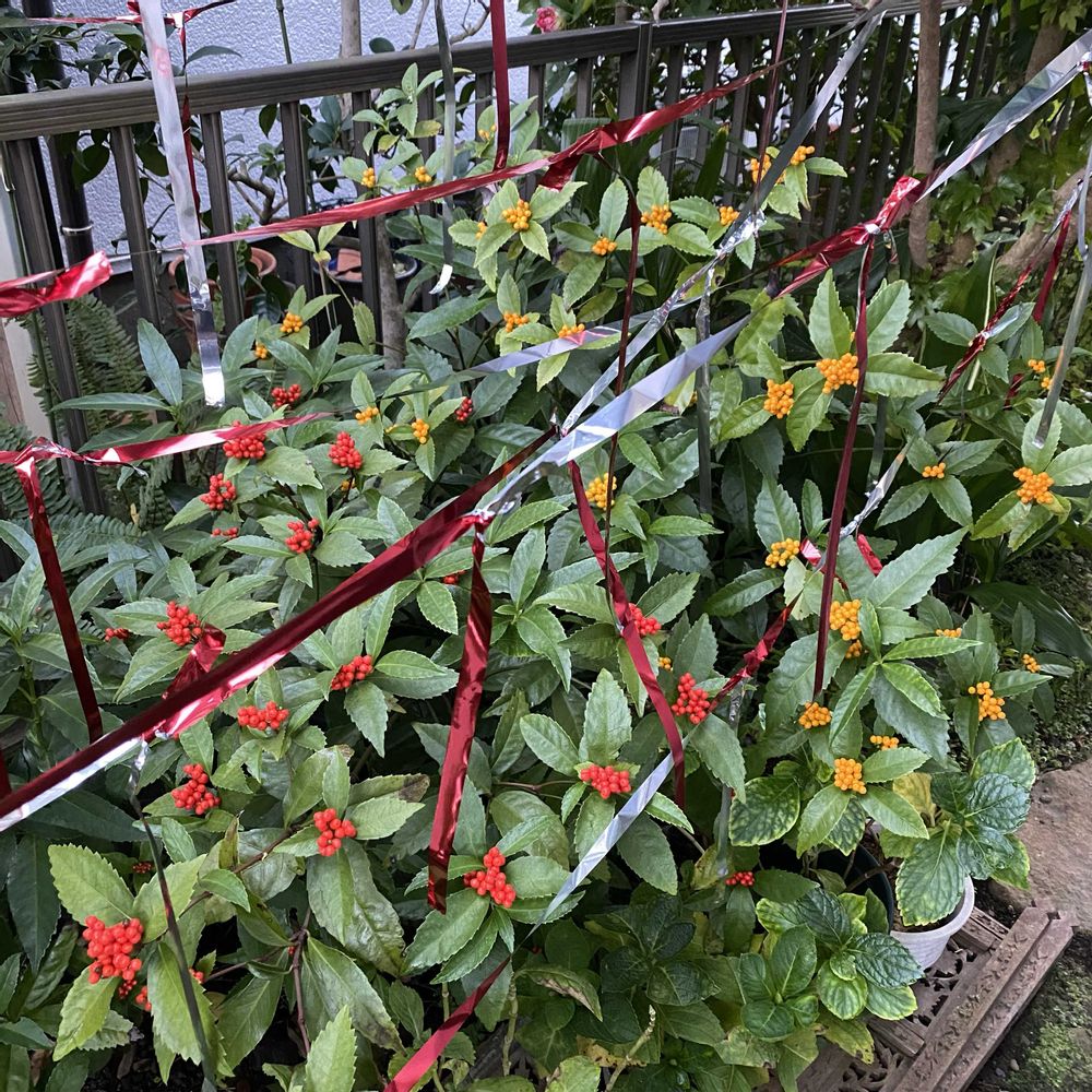 千両の側に大きなヤツデの木があり、千両を覆ってくれているので鳥🐦さんに気づかれない。反対側にはアジサイがあり、その両方の茎にテープを渡しています。今回は更に短いテープを幾つも垂れ下げました。