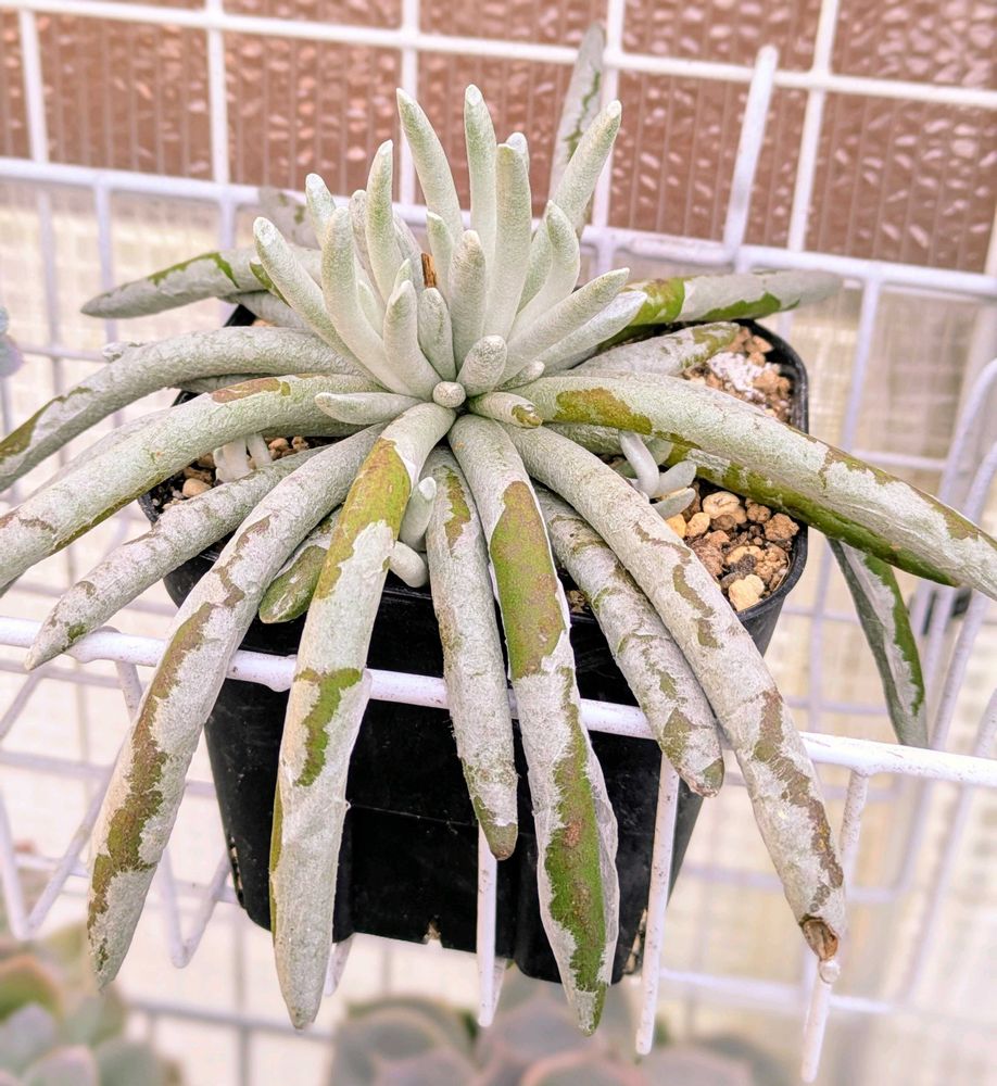 この子、葉に白い膜があってシワシワにさせた後に水やりすると表面の膜が割れて、ボロボロになります😵