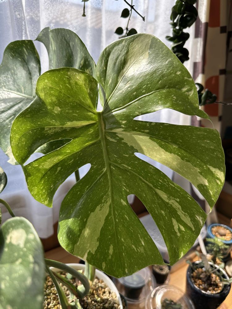 モンステラ、切れ込みができると思っていたら穴が増えた!そして全部穴だったのにいつの間にか1つだけ切れ込みになってる(^^)