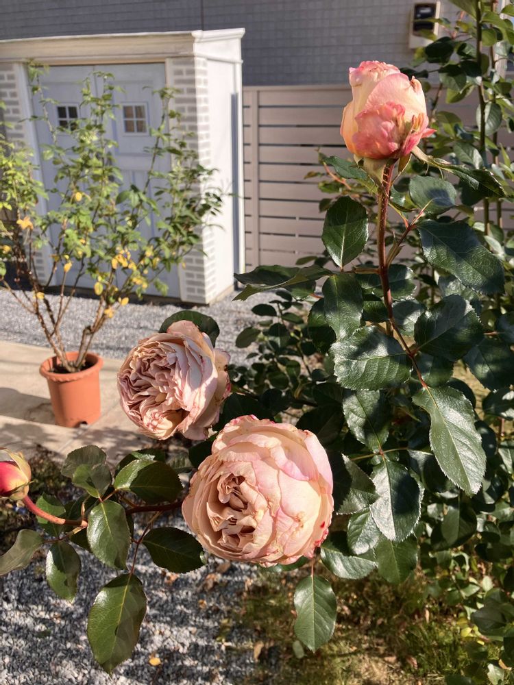 こんばんは⭐️お久しぶりです🤗地植えのラリデガゼル、まだ頑張ってくれてます💕アンティークな茶系バラです☕️高さ1.7mくらい。結構大きくなりました🌿