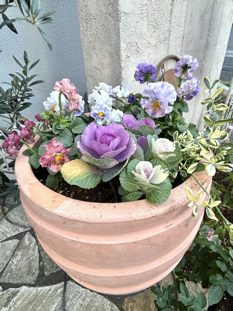 葉牡丹もあまりお迎えしないのですが、1ポットに小さなのが4つ入っていて、思わず💕グリーンを1つお迎えして寄せ植えにしてみました🥰