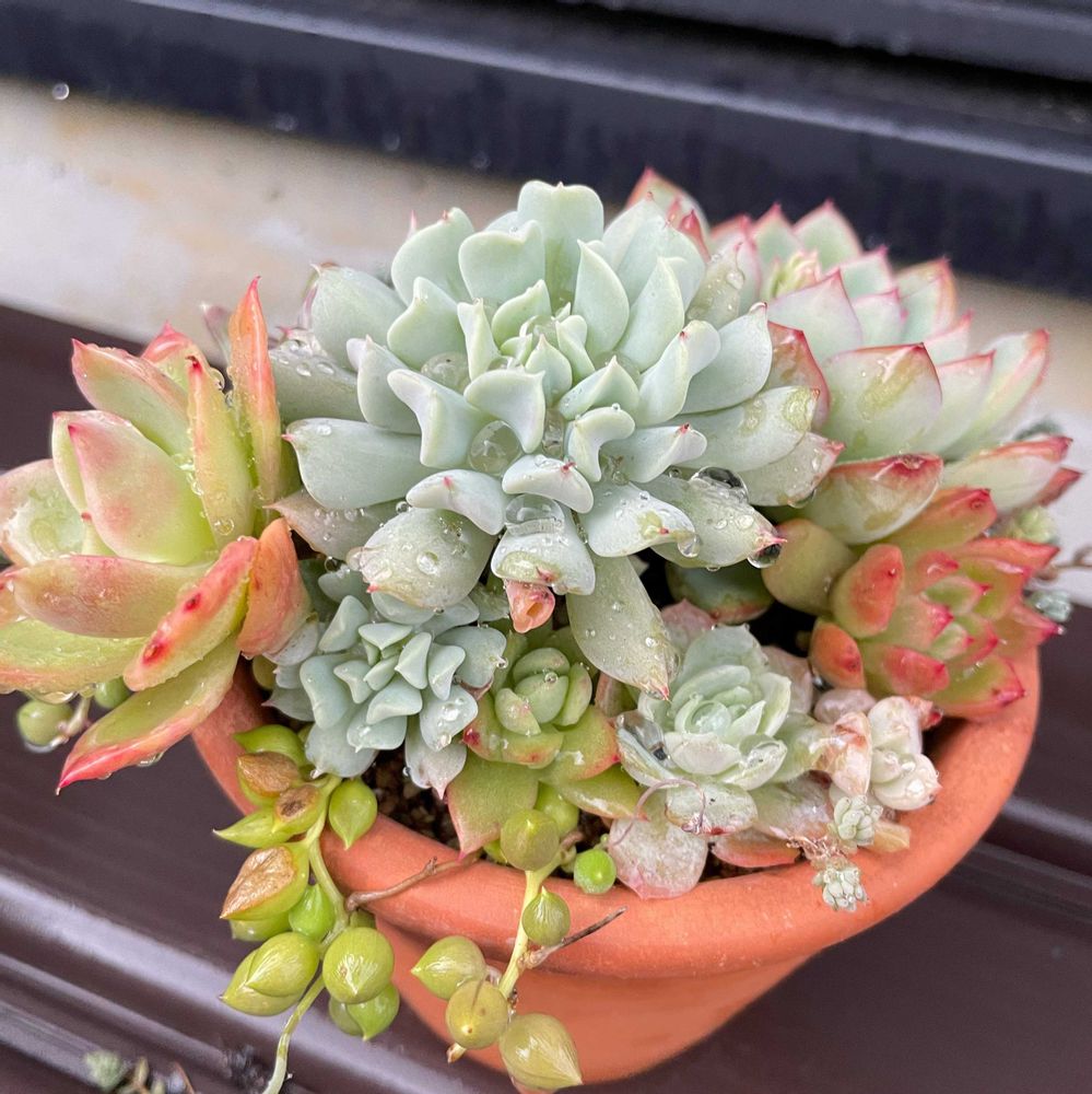 雨に濡れる寄せ植え☔ 雨雲ばかりの毎日だけれど少し色づいてきました🥰