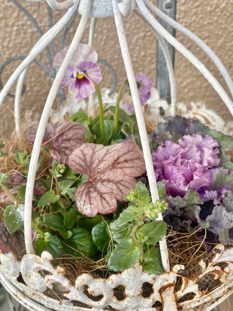 この2つはお迎え初✨葉牡丹は苦手意識があり寄せ植えも作ったことが無かったのですが入っていたビオラとディアスシアの株分した半分と今年株分したヒューケラを寄せてみました🥰