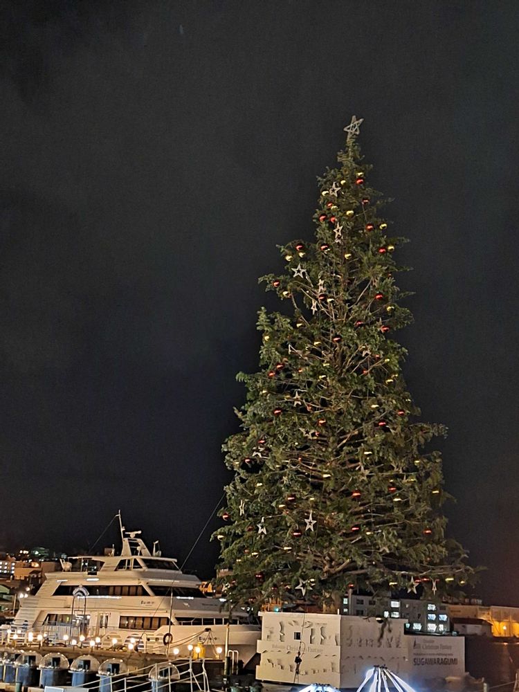 船にツリーが乗っているのだけれど、飾るの大変でしょうね🎄