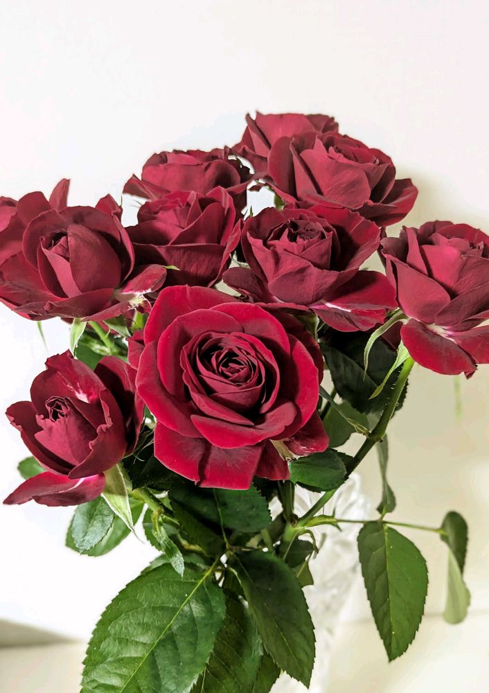 ボルドーのバラ ファンファールさん🌹 イギリスの王室👑のイメージでございます。気高いですね〜🥰 こういうお花は なるべく 茎を長く生けたいですね✂️💞