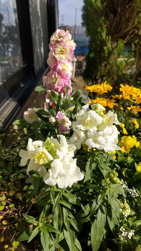 寄せ植えの✨☀️✨キンギョソウと八重のストック、はなびらが増えてきました。