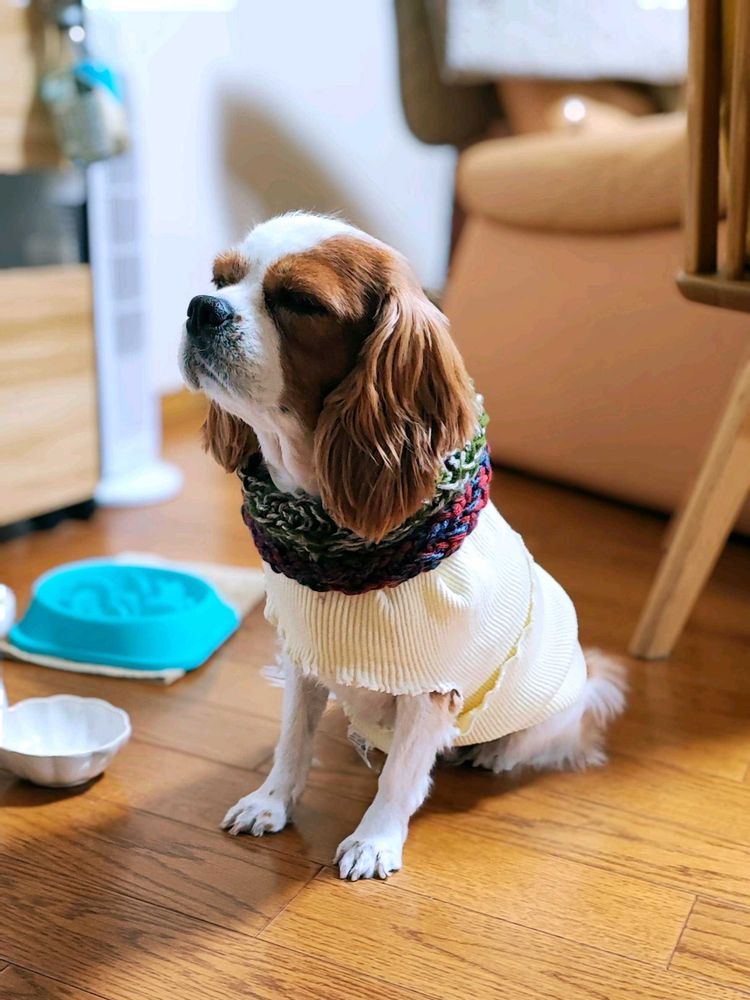 自分で編んで3年使ってくたびれたスヌードをほどいてモモ用にリメイクしました。