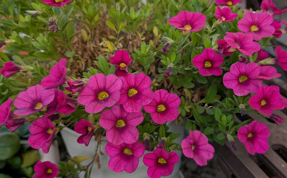 1年草を中心に鉢植え100鉢ぐらいを狭い庭でぎゅうぎゅうに育ててます。ペチュニア系、パンジービオラ系が好き。