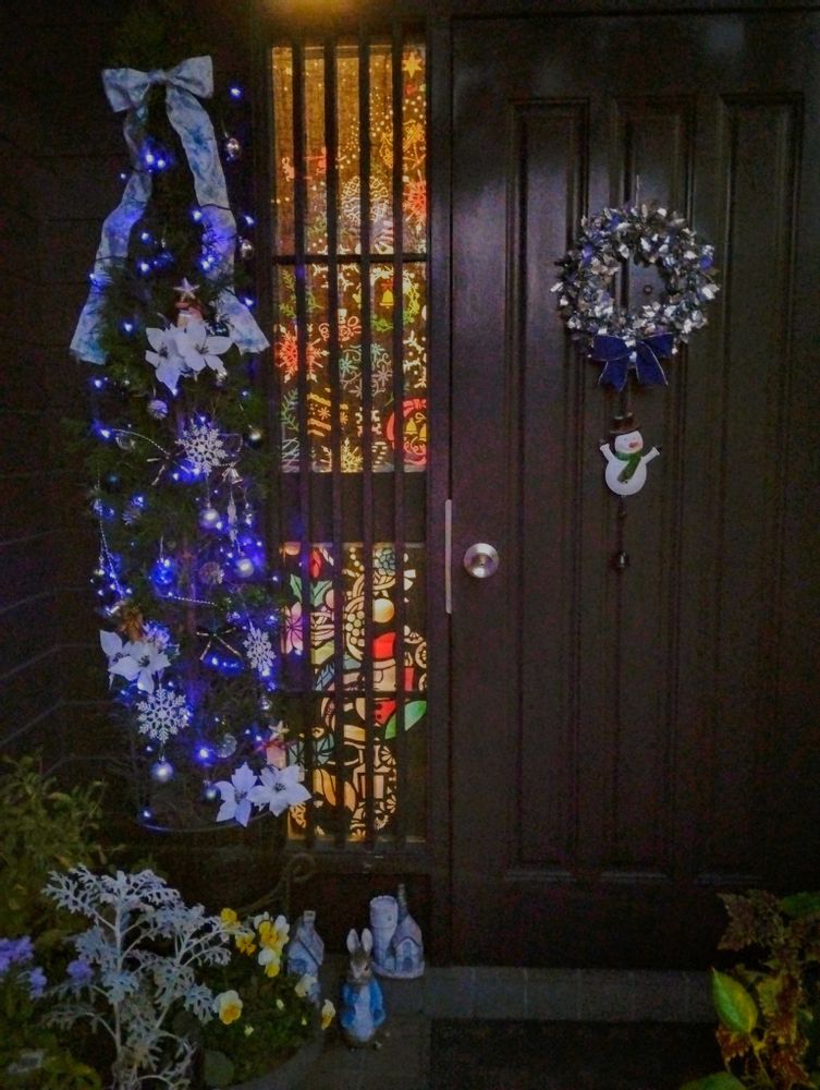 玄関前のコニファーはブルーと白の飾り付け。夜はブルーのイルミネーションが点灯します✨