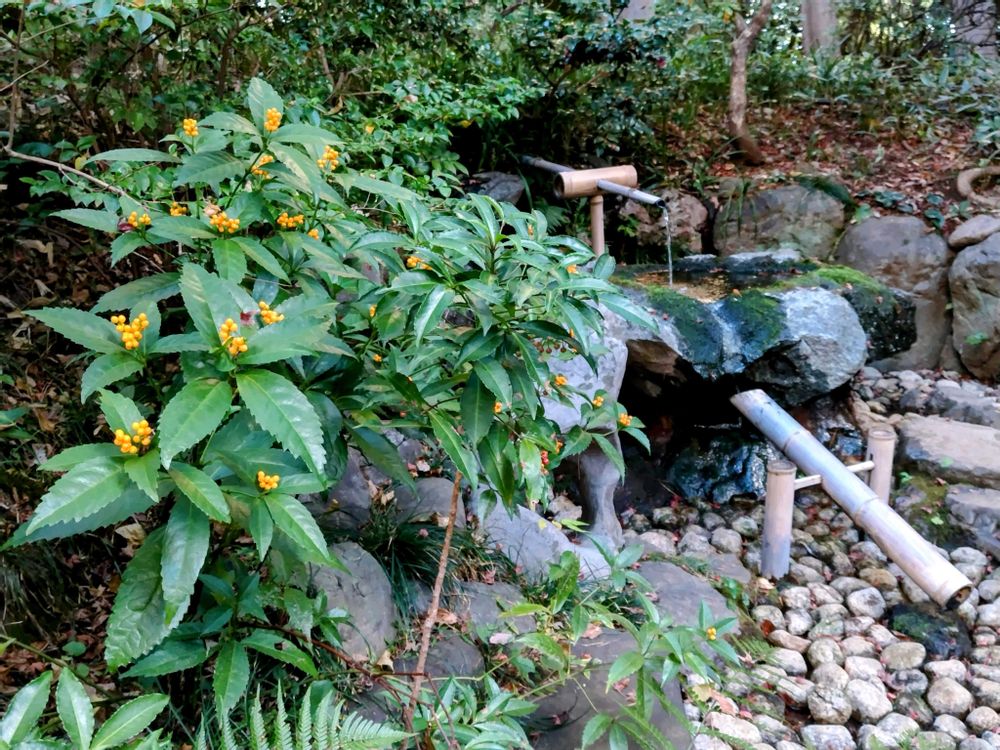 鹿おどしの横に黄色い実をつけた千両が植えられていてとても和風らしい雰囲気を作り出していました👏