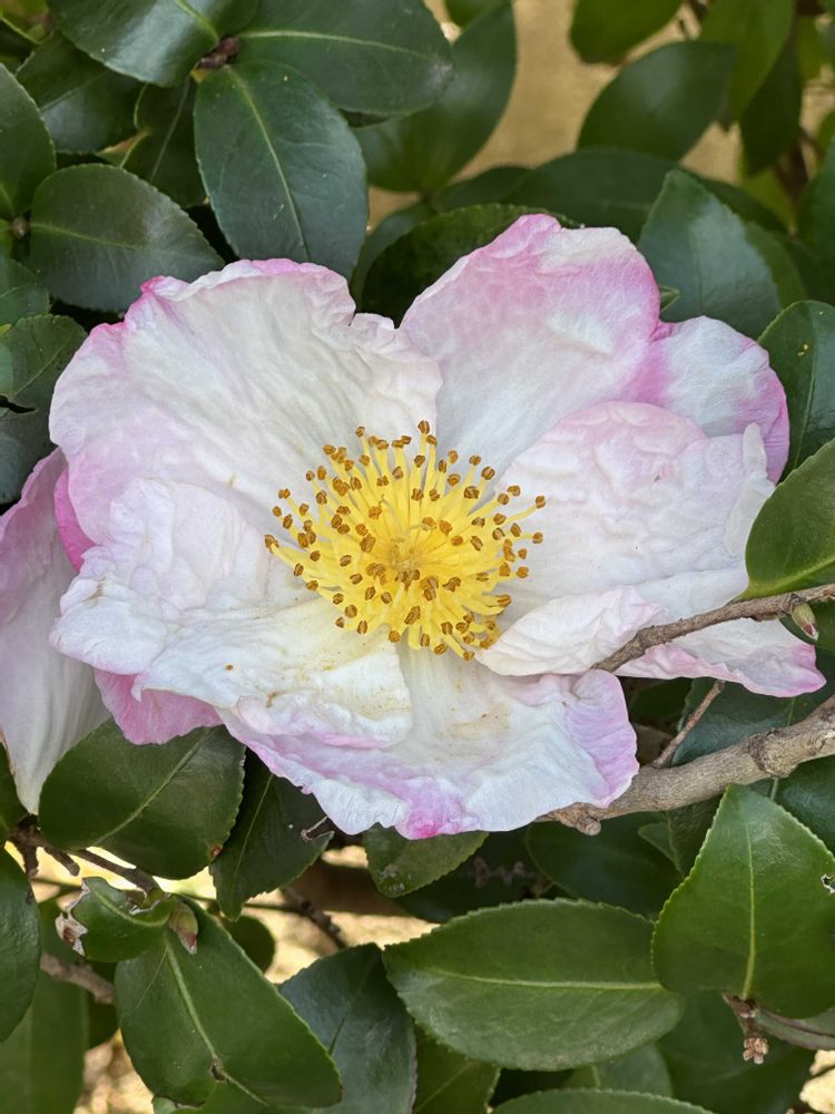 (お花だけ見るとツバキに見えます。葉っぱにギザギザがあるのでサザンカかと…間違っていたら教えてくださいね)