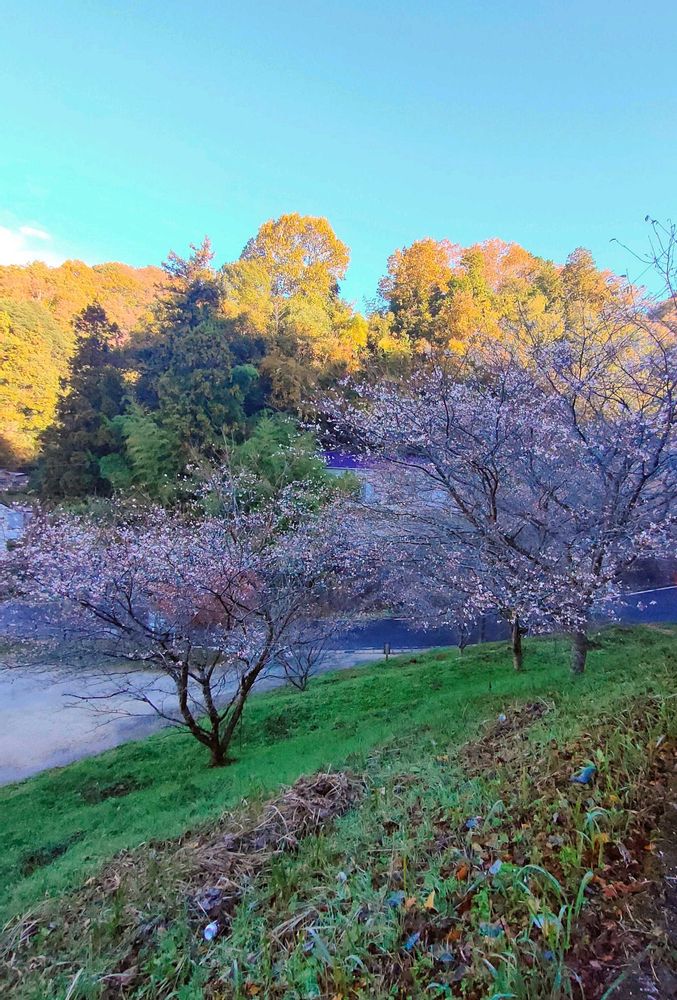 淡いピンクの四季桜と赤と黄色の紅葉🍁を