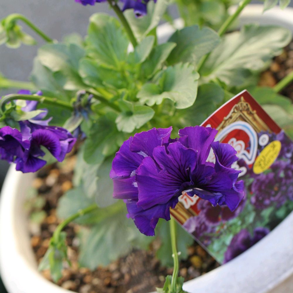 花の淋しくなる季節、 フリル咲きパンジー「絵になるスミレ・マリーヌ」をお迎えしています。