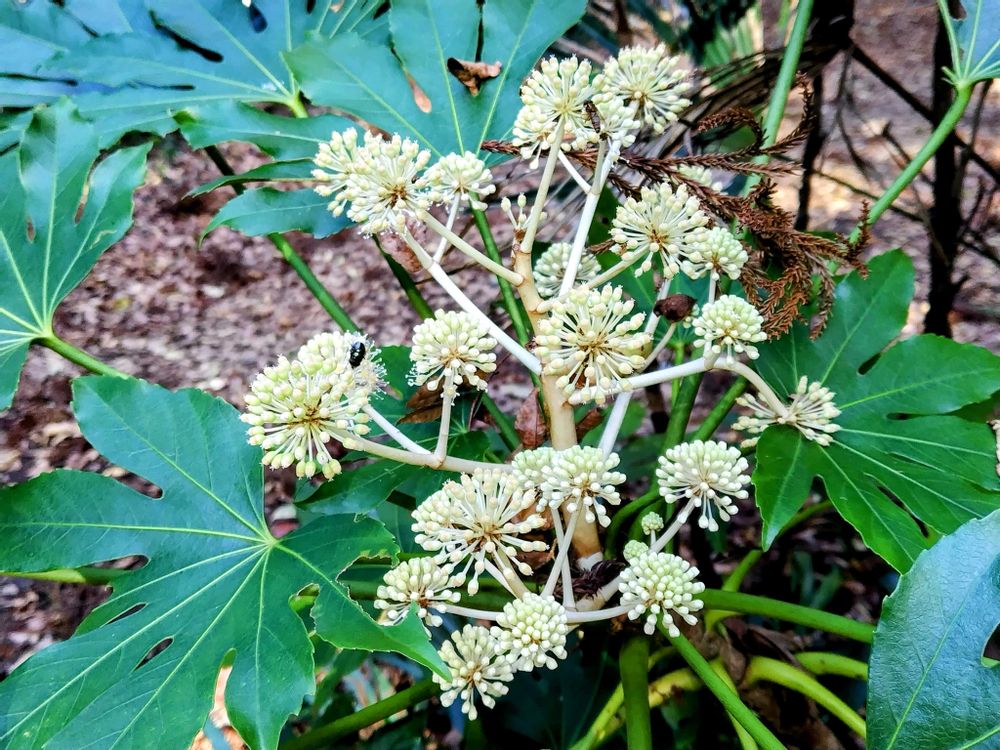 小仏城山から少し歩くと登山道には可愛いタヌキの置物がありそのそばには白いヤツデの花が咲いていました✨