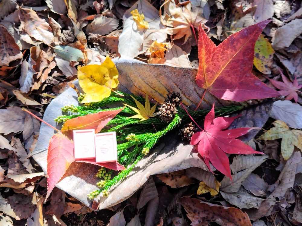 途中朴葉みその朴の木の葉っぱがたくさん落ちていたので落ち葉と一緒にストロベリー🍓味のチョコレートをのせて秋の朴葉チョコレートに🤭