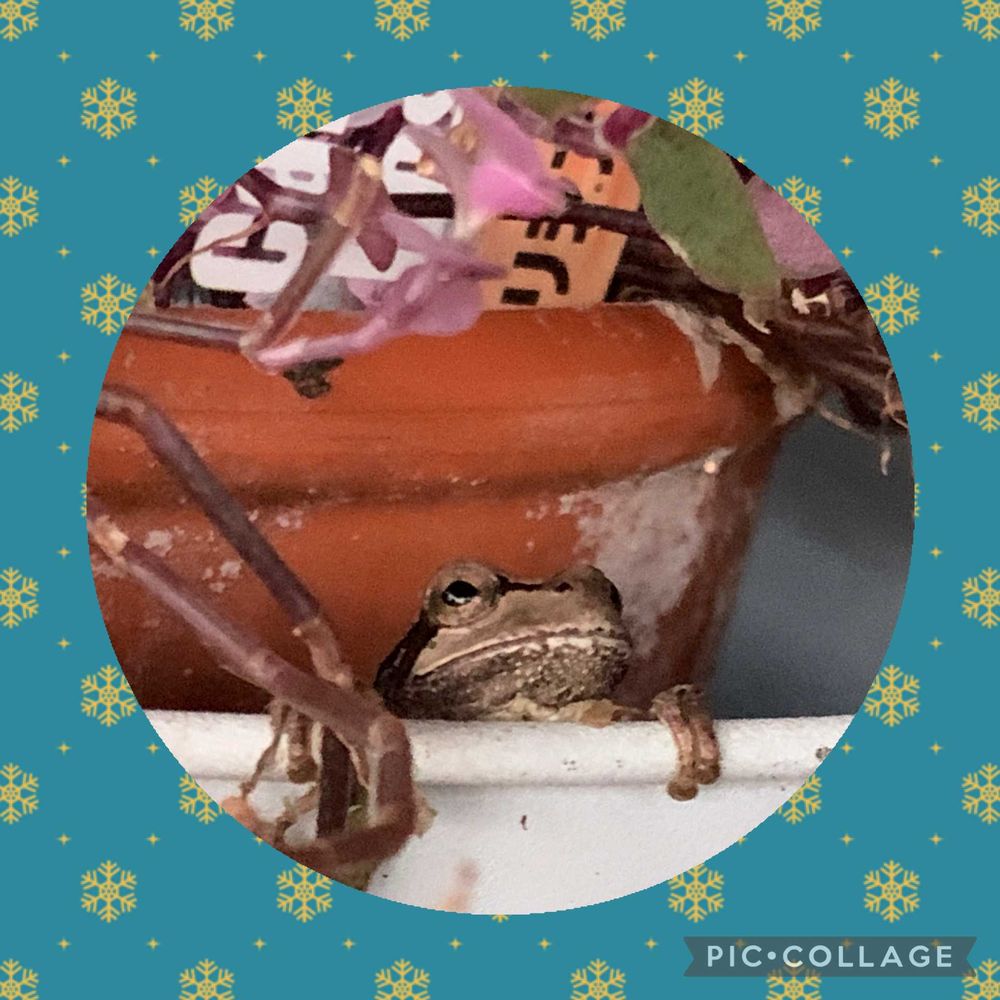 シマトネリコにぶら下げてたカリシアを軒下に移動したら、カエルさんがひょっこり顔出してました🐸そこで冬眠するのかな??