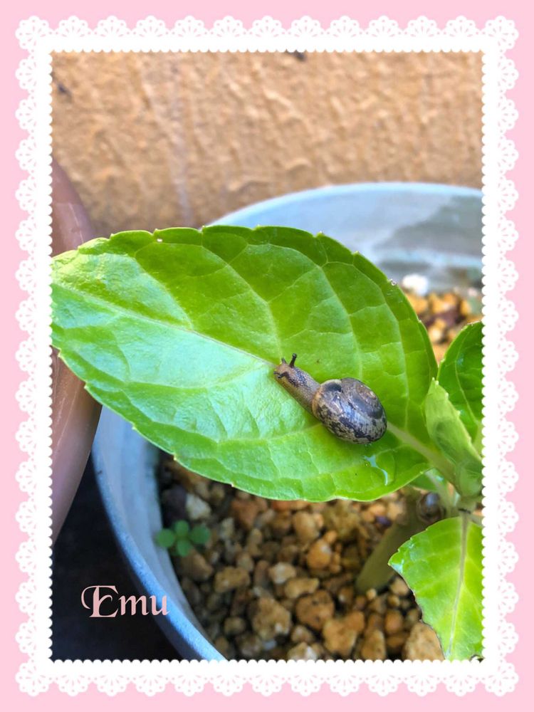 先週、今年挿し木したうちのアジサイの葉に止まっていました🐌