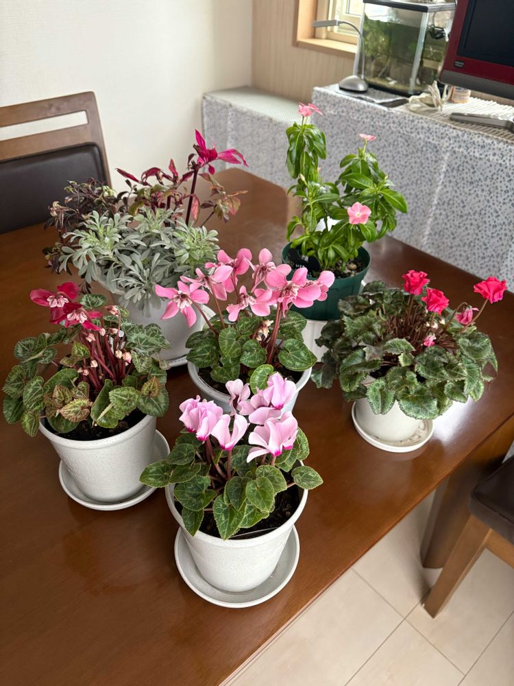 picの子達はガーデンシクラメン、外で売らてた処分価格のポット苗を購入後、鉢に植え替えてリビングに置いて、愉しんでます😙
