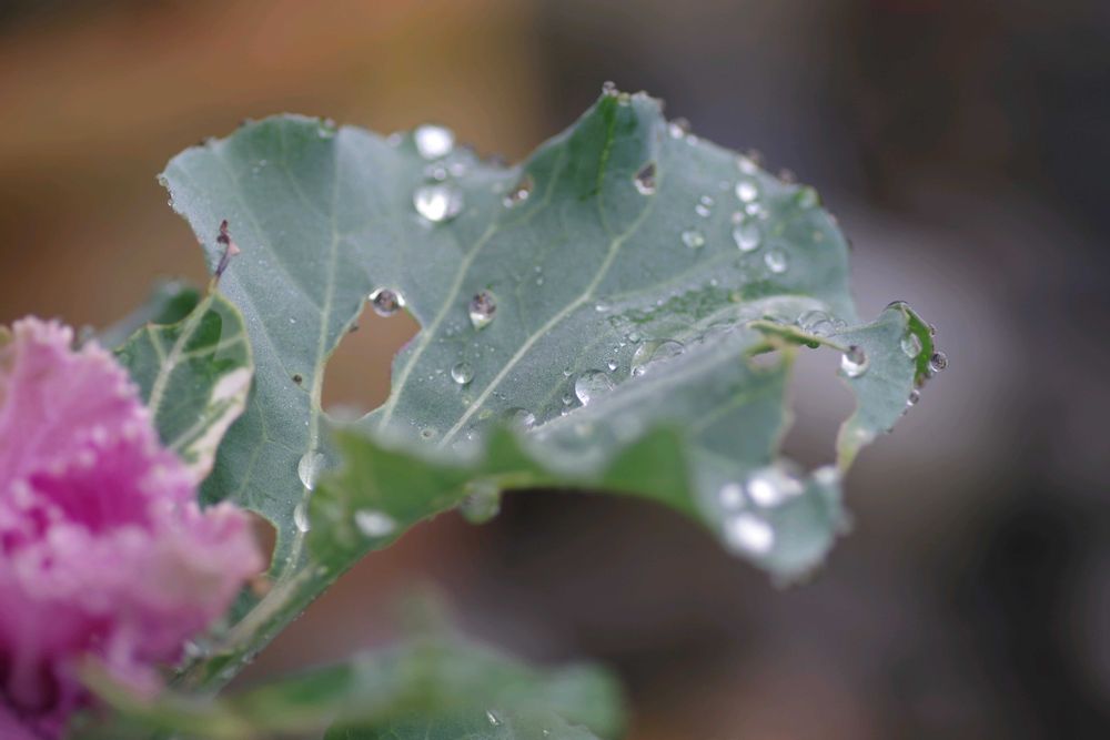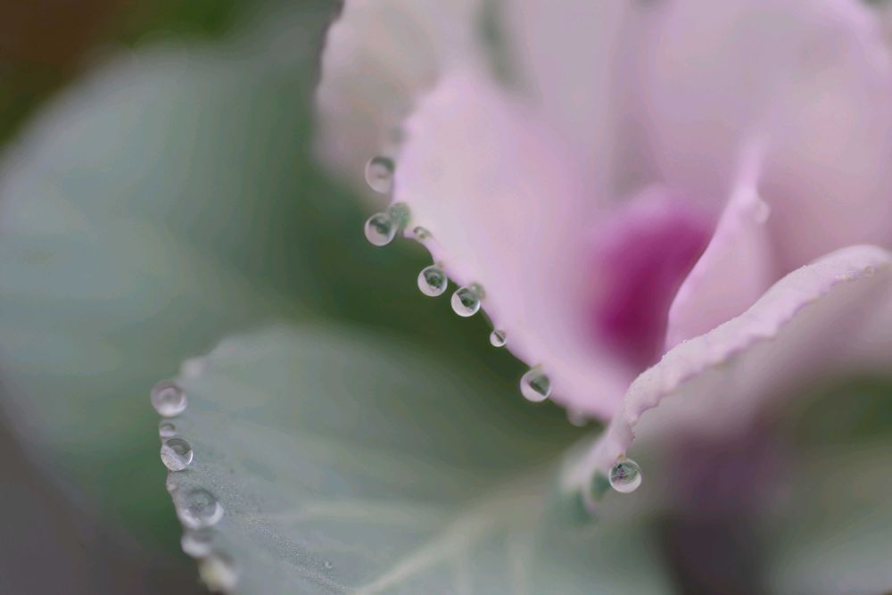 葉牡丹に昨日の霧雨で雫の飾りが