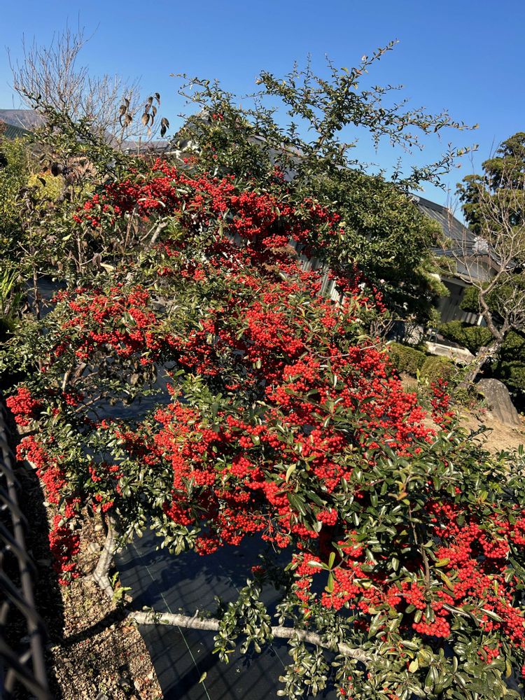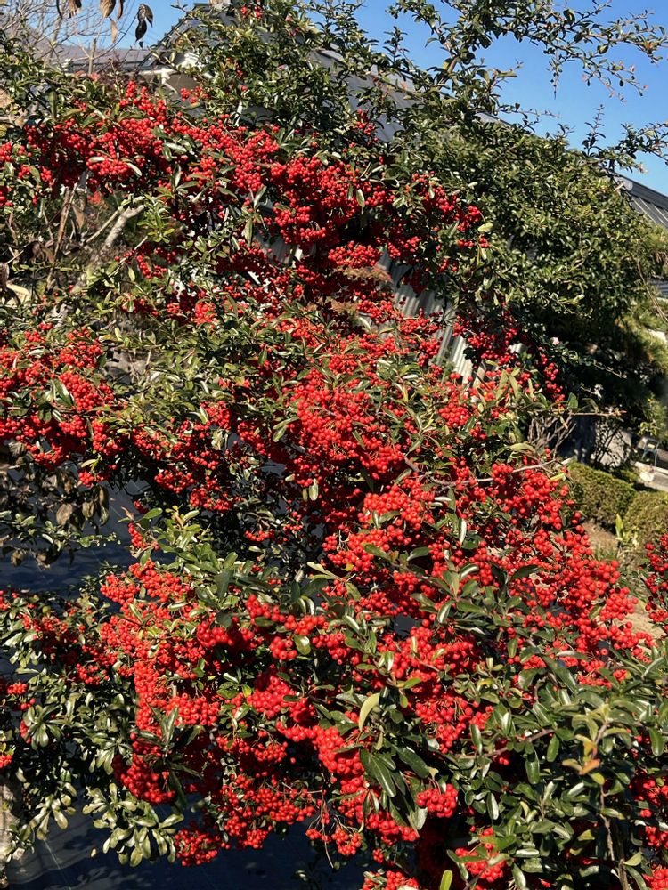 花友さんの庭の真っ赤なピラカンサが鈴なり