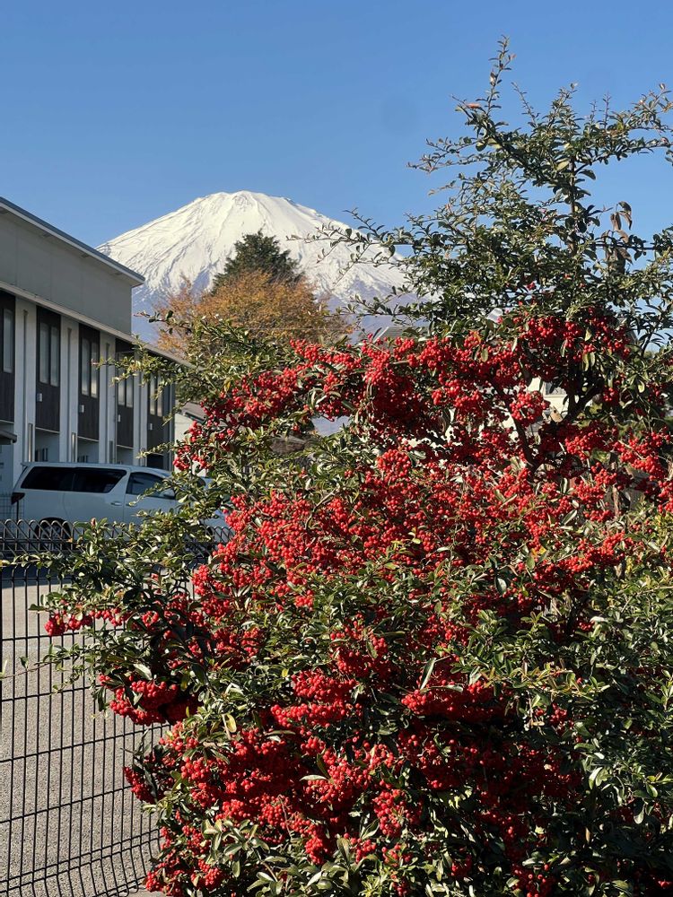 ピラカンサの向こうには,真っ白に雪化粧した富士山がくっきりと見えるんですよ