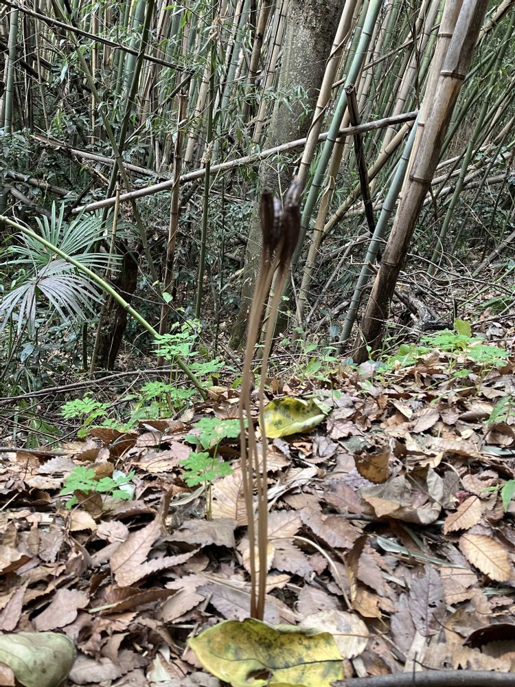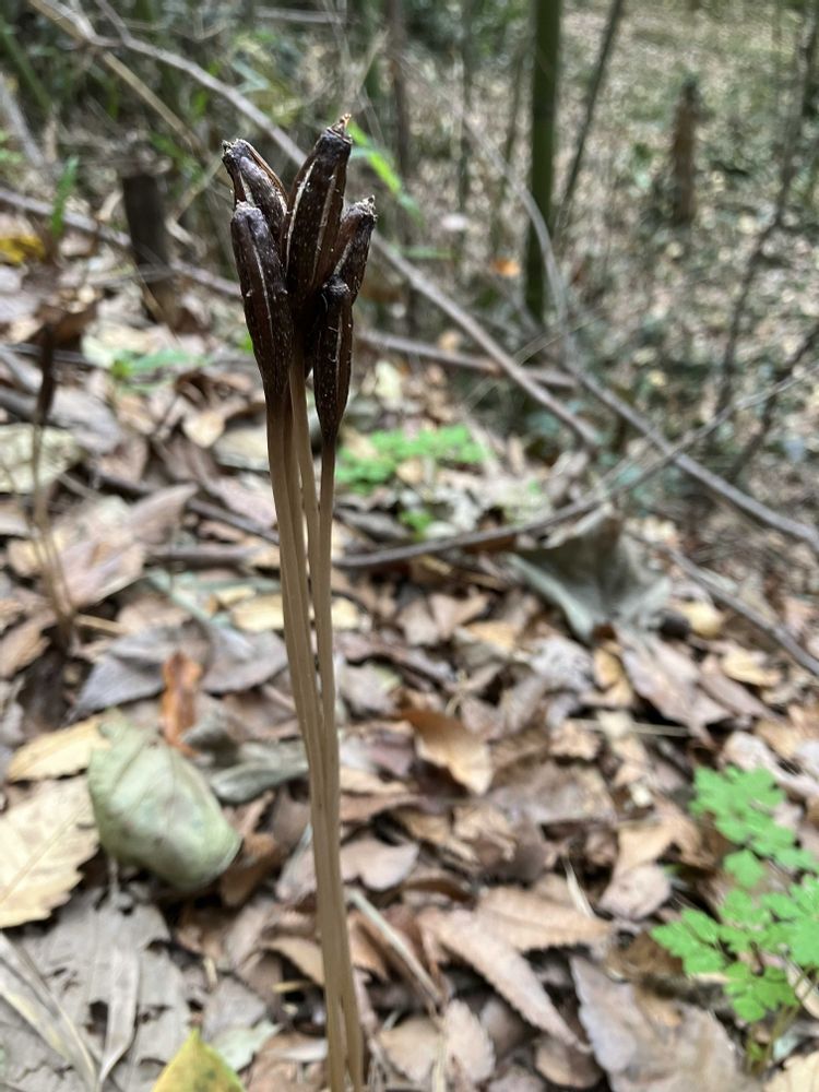 主に竹林に出る菌従属栄養植物で花期は9〜10月、お花は草丈2cm位の小さな目立たない花のようです。 花後にグンと伸びるのですね、面白いですね。